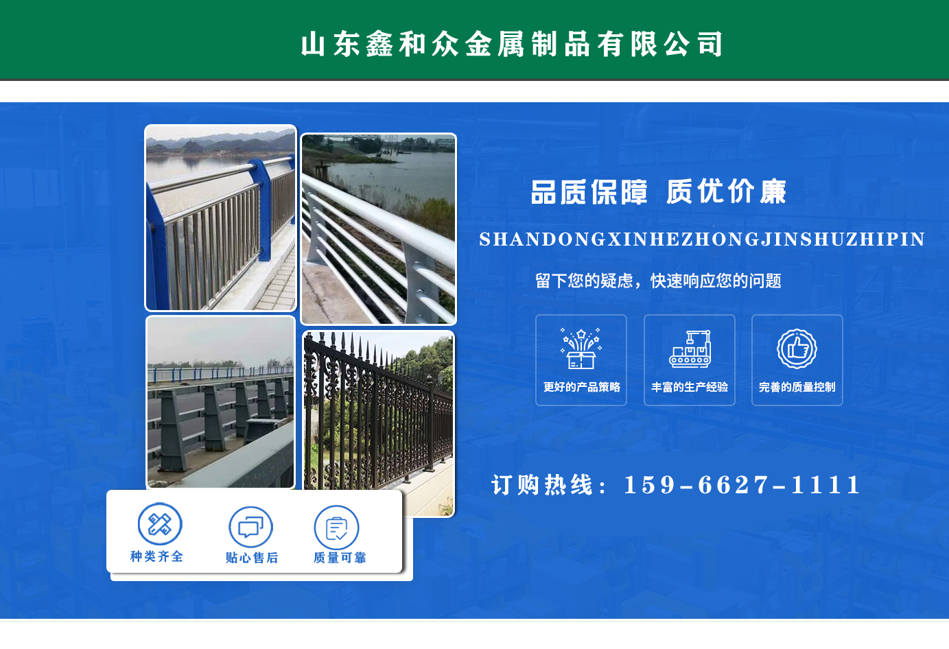 山東鑫和眾金屬制品有限公司主要產(chǎn)品有防撞護欄,橋梁護欄,道路護欄,河道護欄,不銹鋼護欄等護欄。提供設(shè)計方案,一站式定制,包您滿意價格優(yōu)惠,歡迎來電咨詢! 公司常年從事銷售護欄防撞護欄,橋梁護欄,道路護欄,河道護欄,不銹鋼護欄,橋梁鋼護欄,河道燈光護欄等。產(chǎn)品廣泛應用于橋梁、河道、旅游景區(qū)、道路、公路、公園、小區(qū)、景觀、道路防撞等領(lǐng)域?! 」井a(chǎn)品均采用優(yōu)質(zhì)不銹鋼材料,符合相關(guān)標準。各種型號不銹鋼復合管及護欄,質(zhì)量嚴格把控。產(chǎn)品強度高、耐腐蝕、焊接牢固、抗沖擊、性能好,防撞護欄結(jié)構(gòu)簡單、美觀實用大方?! g迎前來訂購!...